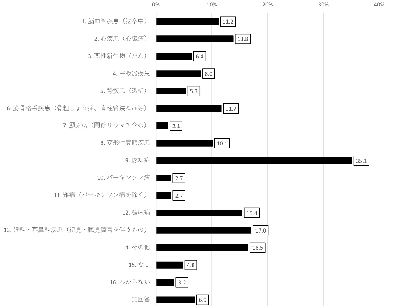 右の図を見ても一目瞭然ですが、岬町の在宅介護で最も割合が高いのが『認知症』です。